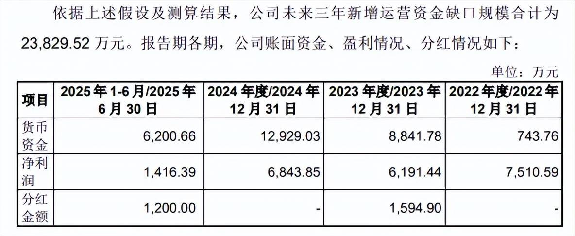 2022年至2025年1-6月(报告期),公司共实施两次分红,2023年、2025年1-6月分别分红1,594.90万元、1,200万元,合计2794.9万元。实际上,公司资产负债率下滑较为明显,从39.35%下滑至24.11%,期末货币资金6200.66万元,足以覆盖同期的短期有息负债,短期借款、一年内到期的非流动负债分别为3460万元、694.65万元。