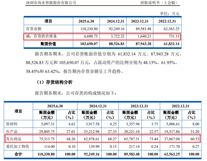 存货高企。报告期内,尚水智能存货高企,分别为6.18亿元、8.79亿元、8.85亿元、10.37亿元,占流动资产比例分别为48.13%、61.95%、58.45%、63.42%。