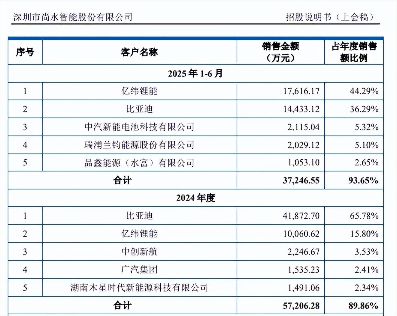 客户集中度高,主要依赖比亚迪、亿纬锂能。尚水智能主营业务收入9成以上由新能源电池极片制造智能装备贡献,2024年、今年上半年的收入分别为6.06亿元、3.85亿元,占比分别为95.2%、96.85%。