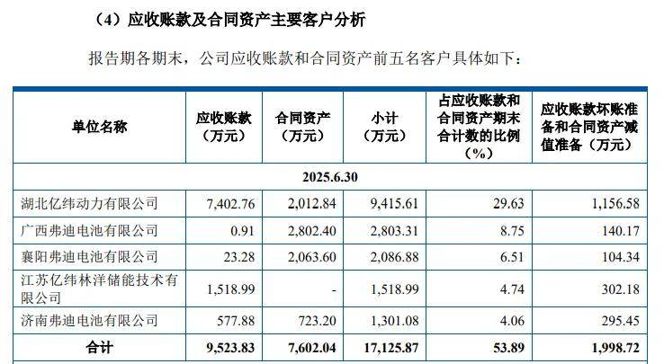 据披露,公司应收账款前五客户来源于比亚迪、亿纬锂能,2025年1-6月为例,公司对湖北亿纬动力有限公司、广西弗迪电池有限公司、襄阳弗迪电池有限公司、江苏亿纬林洋储能技术有限公司、济南弗迪电池有限公司的应收账款分别为7,402.76万元、0.91万元、23.28万元、1,518.99万元、577.88万元,合计9,523.83万元,应收账款坏账准备和合同资产减值准备为1,998.72万元,计提比例20.99%。