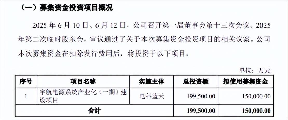 本次IPO,公司拟公开发行人民币普通股不超过39,080.00万股且不低于17,370.00万股,拟募集资金15亿元,全部用于宇航电源系统产业化(一期)建设项目。