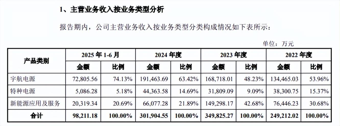 公司表示,2023年主营业务毛利率下滑主要系系新能源应用及服务业务收入占比增加,拉低整体毛利率;2025年上半年毛利率下滑主要系公司在传统航天领域通常按照航天总体单位等客户要求,于下半年集中交付宇航电源产品,部分高毛利业务收入集中在下半年乃至第四季度确认,同时上半年发行人商业航天领域收入占比提升。