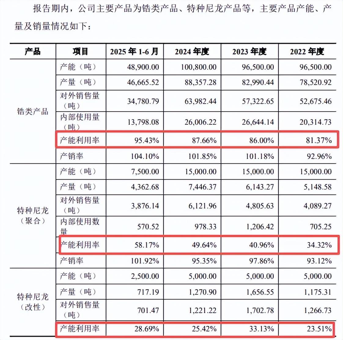 上交所没有对扩产项目进行问询。2022年至2025年1-6月(报告期),长裕集团锆类产品产能利用率稳步上升,分别为81.37%、86%、87.66%、95.43%,2024年产能为10.08万吨。