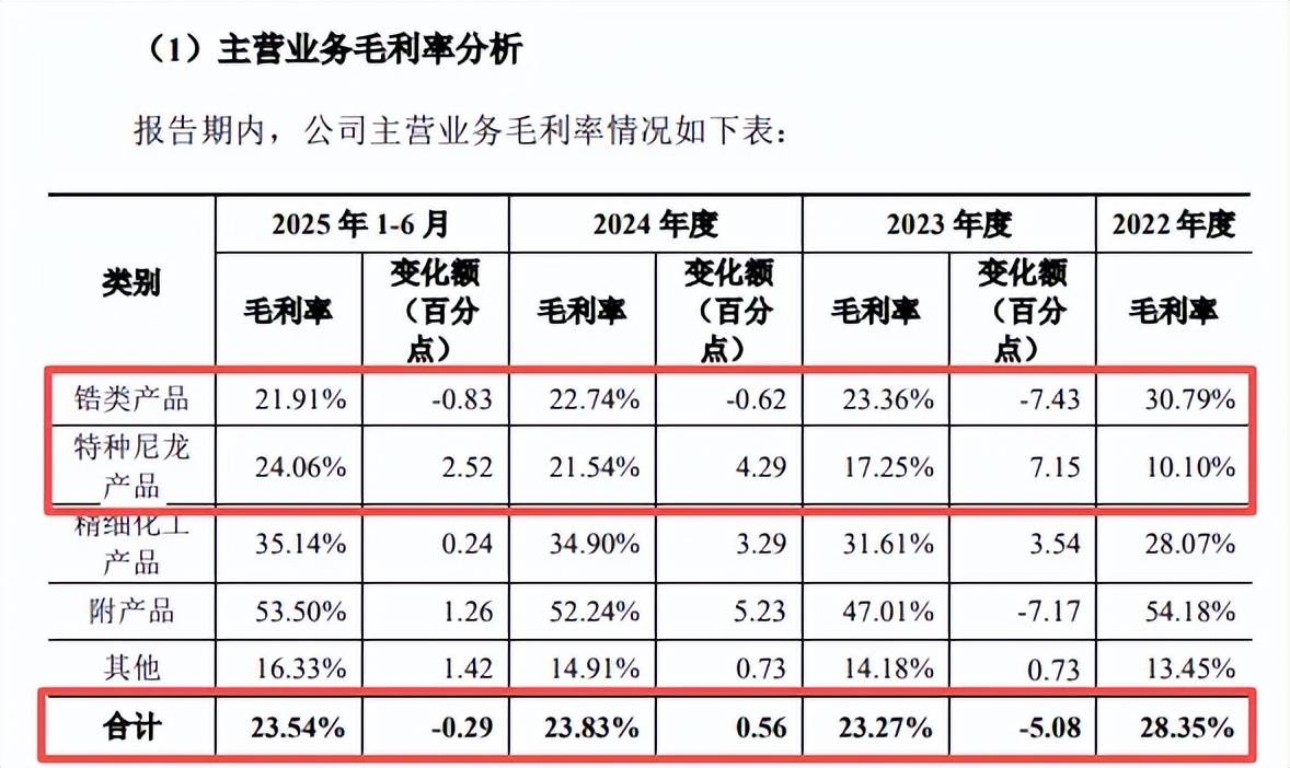 从毛利率来看,公司主营业务毛利率总体呈现下滑态势,分别为28.35%、23.27%、23.83%、23.54%,累计下滑4.81个百分点。其中锆类产品毛利率持续下滑,从30.79%下滑至21.91%,累计下滑8.88个百分点,是导致主营业务毛利率下滑的根源,不过特种尼龙产品毛利率则呈现上升态势,从10.1%上升至24.06%,累计上升13.96个百分点,再叠加收入占比的提升,让主营业务毛利率自2023以来小幅提升。