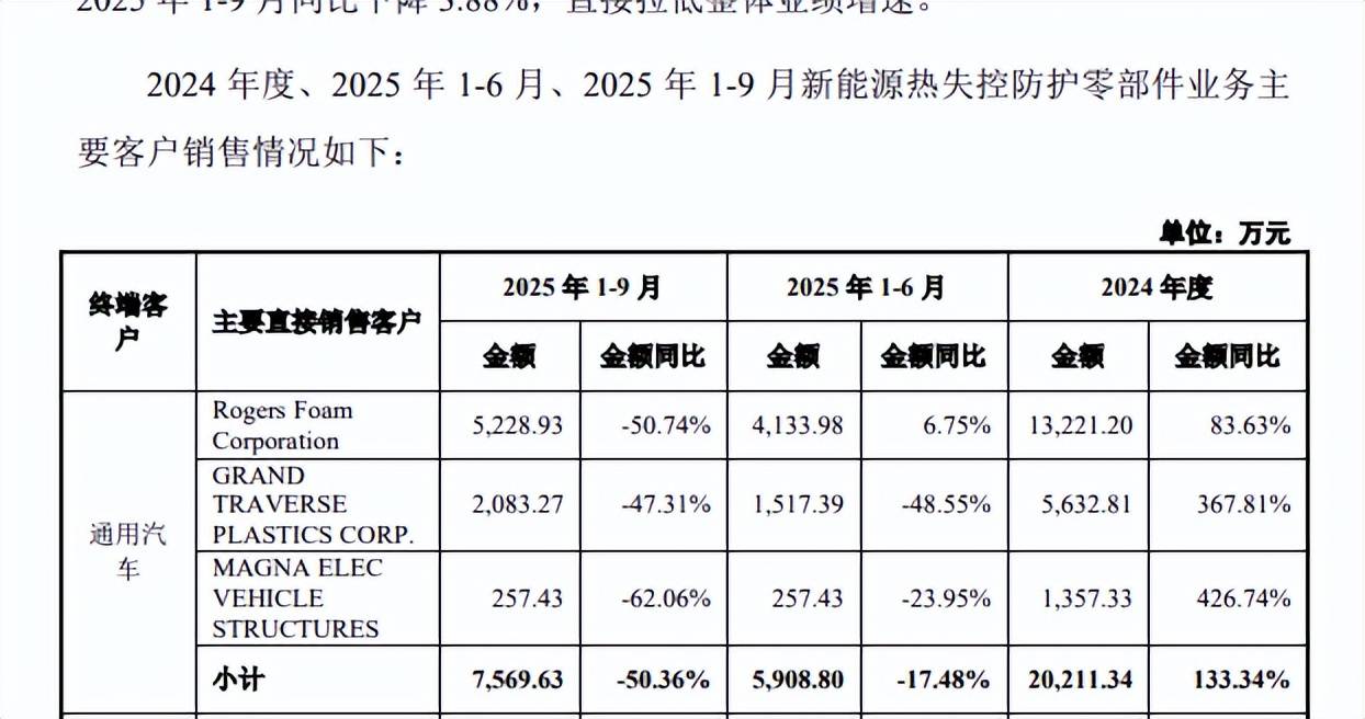 今年前三季度,动力电池热失控防护零件实现收入4.35亿元,同比下滑3.88%,核心业务承压是导致公司业绩增速放缓的关键因素,其中对通用汽车销售额大幅下降,销售额为0.76亿元,同比大降50.36%,金额腰斩。