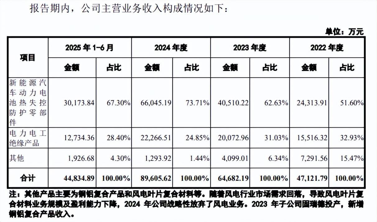核心业务收入年内下滑,对通用汽车销售额腰斩。固德电材主营业务收入主要来自于新能源汽车动力电池热失控防护零部件、电力电工绝缘产品,前者是收入重头,报告期内实现收入分别为2.43亿元、4.05亿元、6.6亿元、3.02亿元,占比从51.6%上升至67.3%;后者收入分别为1.55亿元、2.01亿元、2.23亿元、1.27亿元,收入占比从32.93%下滑至28.4%。
