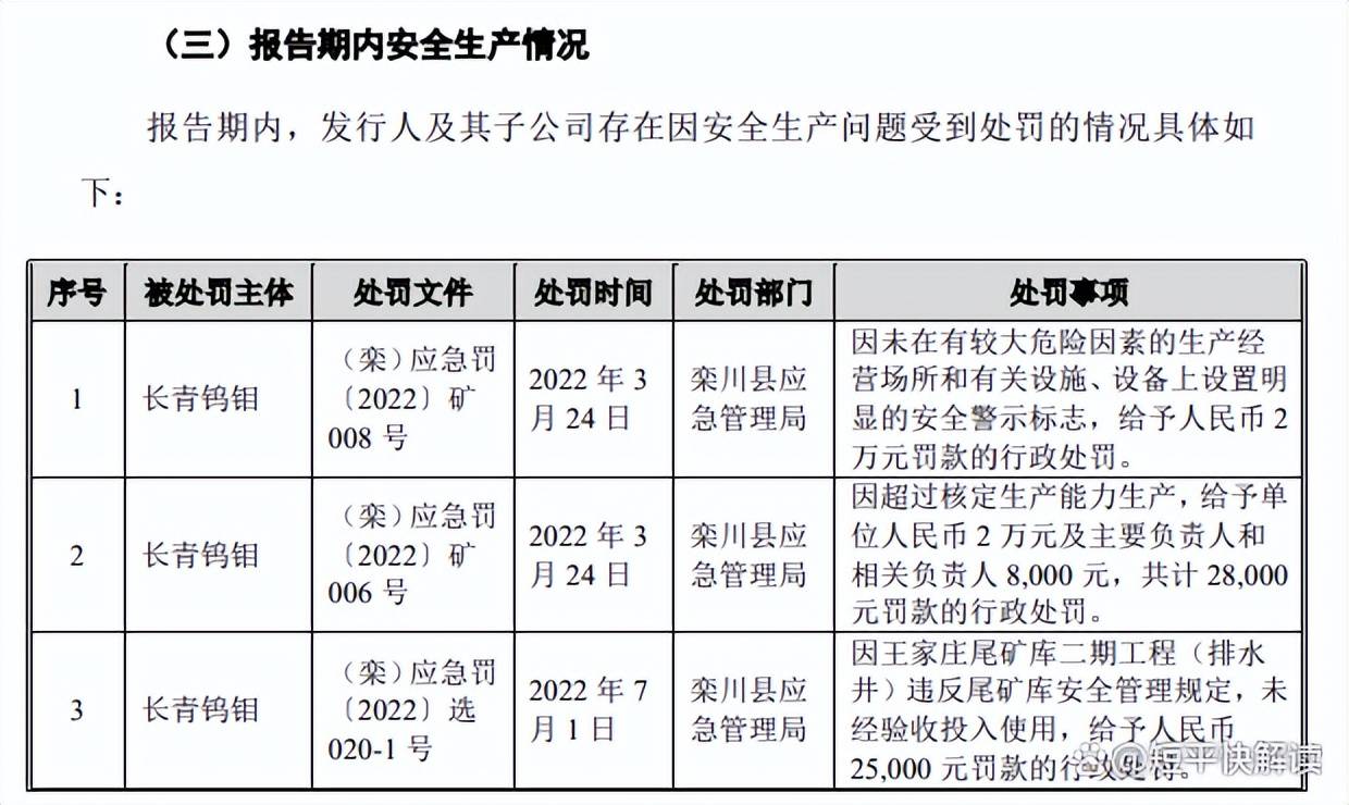 不过,长青钨钼在安全生产方面有待加强,在剥离的那一年受到三次行政处罚,3月24日因未在有较大危险因素的生产经营场所和有关设施、设备上设置明显的安全警示标志被罚款2万元;同日,因超过核定生产能力生产,企业及主要负责人分别被罚款2万元、8000元。
