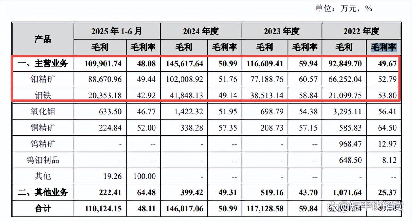 钼精矿和钼铁收入贡献占比超99%,毛利率自2023年以来持续下滑。盛龙股份主营业务收入主要由钼精矿和钼铁贡献,前者报告期实现收入分别为12.55亿元、12.74亿元、19.71亿元、17.93亿元,占比从67.14%上升至78.46%;后者实现收入分别为3.92亿元、6.54亿元、8.52亿元、4.74亿元,占比从波动较大,分别为20.98%、33.65%、29.82%、20.75%。