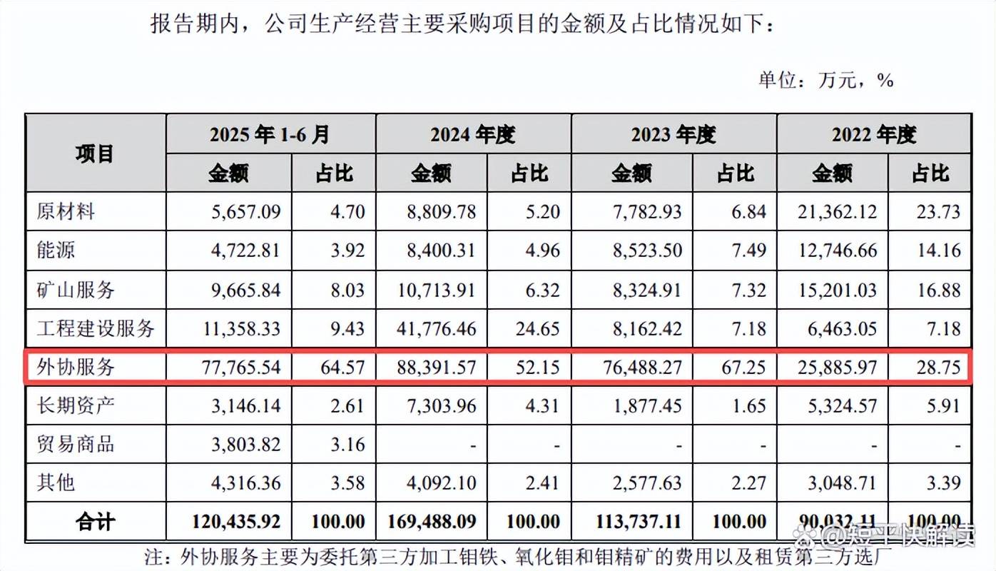 外协服务占比超六成。报告期内,盛龙股份子公司龙宇钼业自有选矿能力与采矿能力不匹配,因此龙宇钼业积极开拓外部选厂,通过委外加工和经营租赁相结合的方式弥补自有选矿能力的不足。