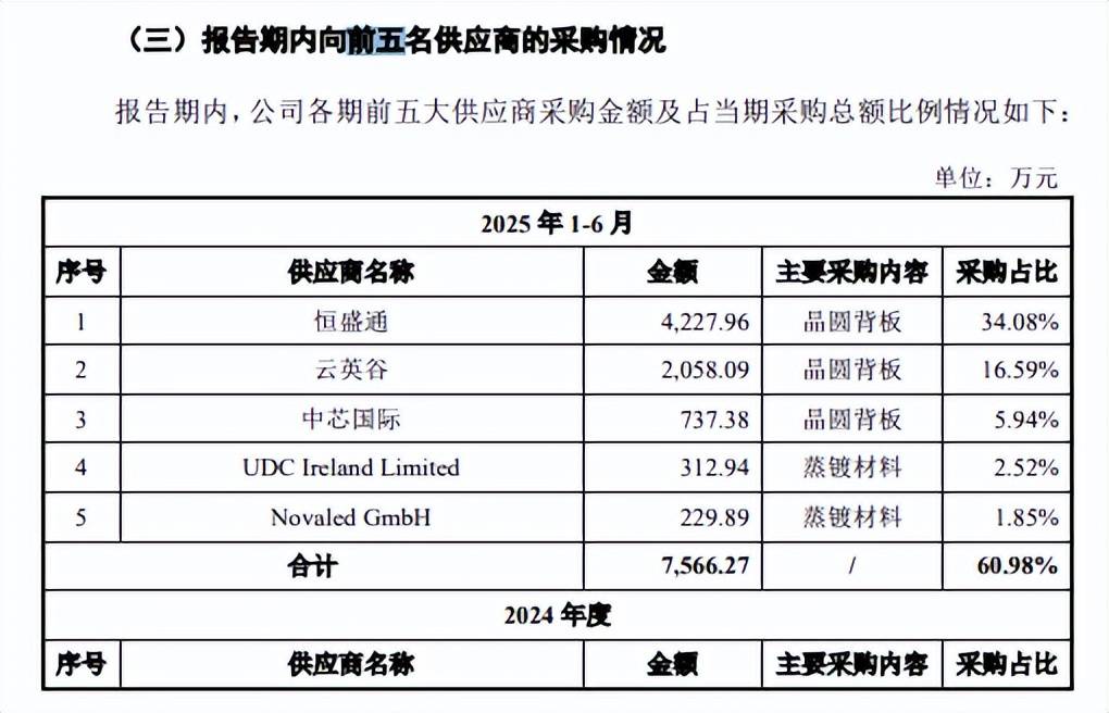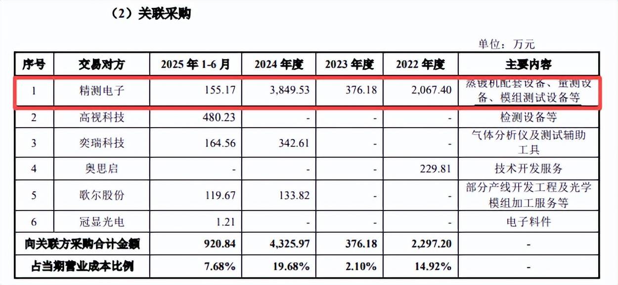 精测电子是不是前五供应商?报告期内,视涯科技向关联方精测电子的采购额分别为2,067.40万元、376.18万元、3,849.53万元、155.17万元,采购内容是蒸镀机配套设备、量测设备、模组测试设备等。