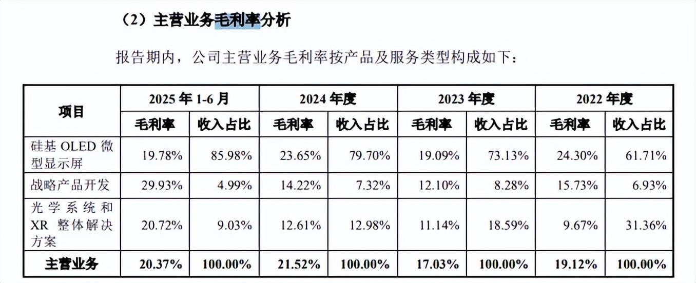 颇为意外的是,公司主营业务毛利率并不高,存在明显波动,分别为19.12%、17.03%、21.52%、20.37%,核心产品硅基OLED微型显示屏毛利率分别为24.3%、19.09%、23.65%、19.78%,高研发投入之下,毛利率却仅为20%左右,并非外界想象中的高毛利行业。