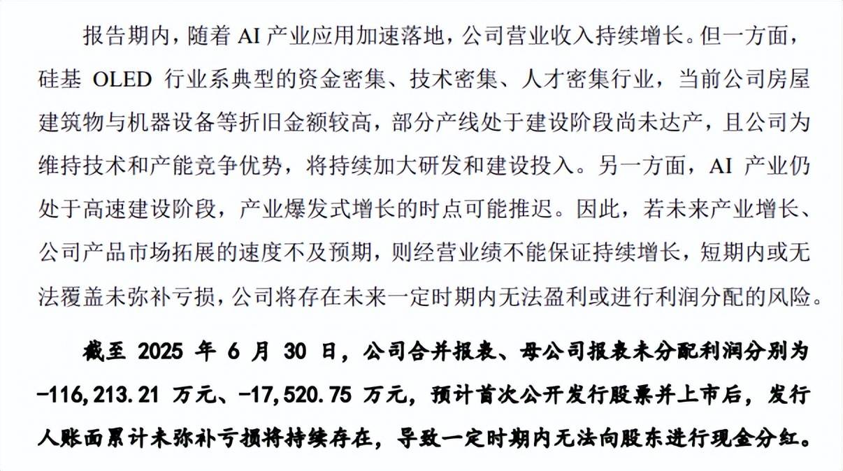 截至2025年6月30日,公司合并报表未分配利润亏损11.62亿元,预计上市后账面累计未弥补亏损将持续存在,导致一定时期内无法向股东进行现金分红。