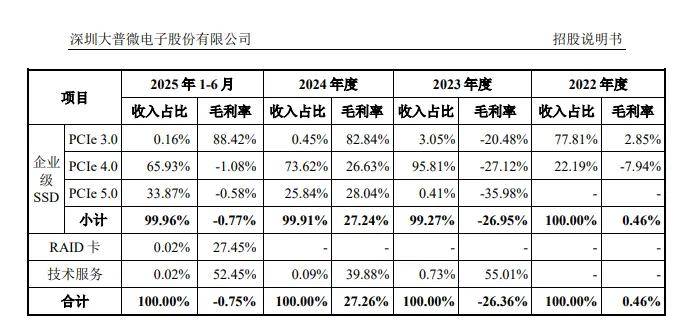 企业级SSD收入贡献超99%,毛利率波动剧烈。大普微收入基本来自于企业级SSD,报告期分别为3.86亿元、5.05亿元、9.6亿元、7.48亿元,期末占比99.96%,其中来自PCIe4.0的收入分别为0.86亿元、4.88亿元、7.07亿元、4.93亿元,占比从22.19%上升至65.93%,另外PCIe5.0收入迅速提高,从2023年的210.58万元上升至2025年上半年的2.53亿元,占比从0.41%上升至33.87%。