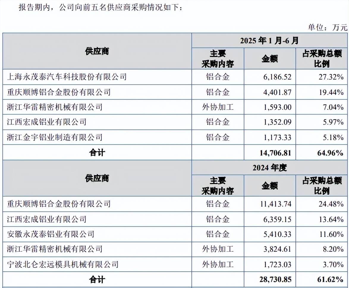 期末对上海永茂泰汽车科技股份有限公司、重庆顺博铝合金股份有限公司采购额分别为0.62亿元、0.44亿元,占比分别为27.32%、19.44%,主要采购铝合金。