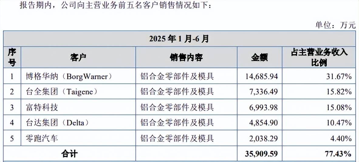 期末前五大客户包括博格华纳、台全集团、富特科技、台达集团、零跑汽车,其中对第一大客户的销售额、占比分别为1.47亿元、31.67%。