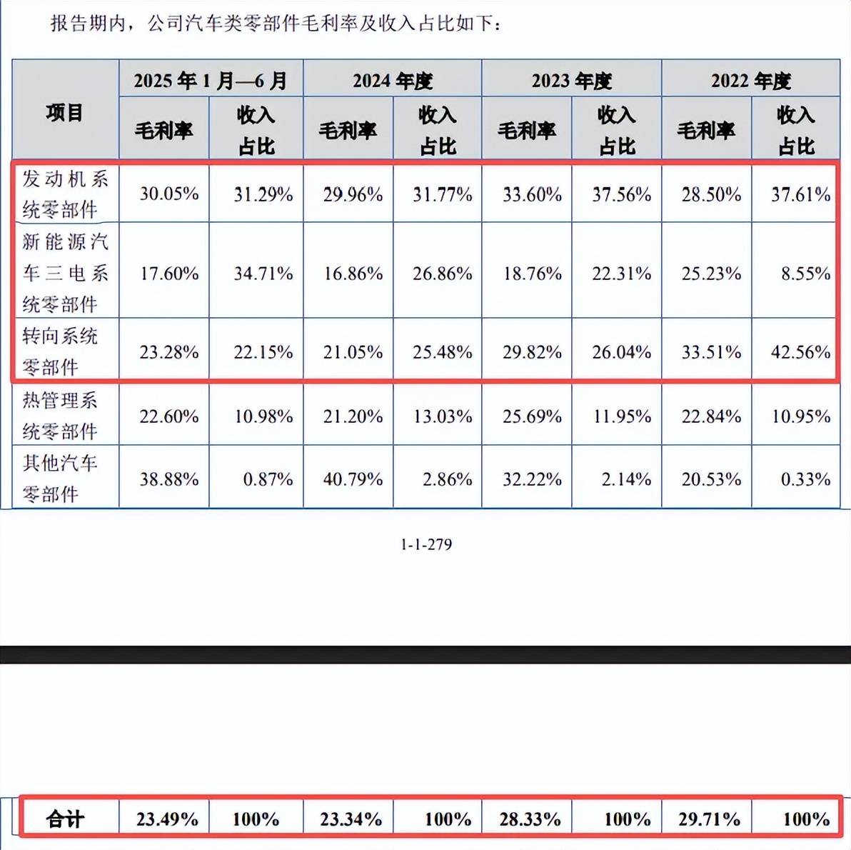 具体来看,汽车类零部件毛利率分别为29.71%、28.33%、23.34%、23.49%,其中发动机系统零部件从28.5%上升至30.05%,不过收入占比从8.55%猛升至34.71%的新能源汽车三电系统零部件,毛利率则呈现下滑态势,从33.51%下滑至23.28%,公司称受市场竞争较为激烈,产品生产工艺复杂等因素影响。