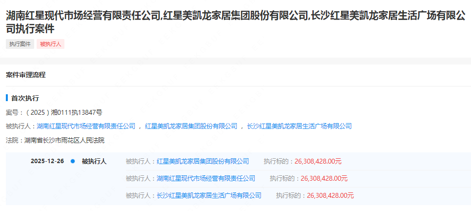 企查查显示,12月26日,湖南红星现代市场经营有限责任公司 , 红星美凯龙家居集团股份有限公司 , 长沙红星美凯龙家居生活广场有限公司三家公司新增被执行人记录,执行标的,26,308,428.00元,执行法院是湖南省长沙市雨花区人民法院,执行案号是(2025)湘0111执13847号。