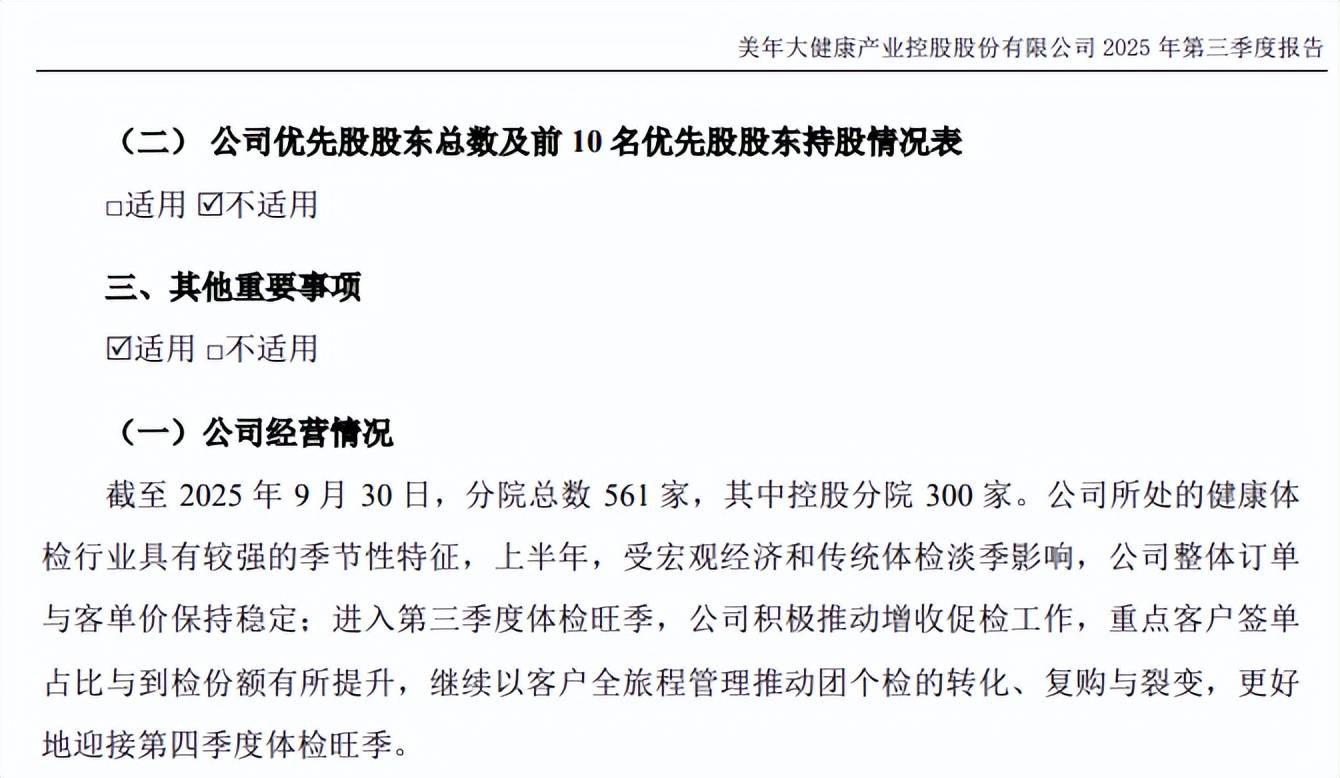国内民营体检领域的龙头——美年健康,近年来业绩波动较大,去年前三季度收入小幅下滑,而净利大幅增长,不过经营现金流则净流出1.82亿元。据2025年中报,公司收入超95%由体检服务贡献,过半地区收入出现下滑,另外,分院持续缩减,体检客单价也有所下滑,改变往年增长态势。