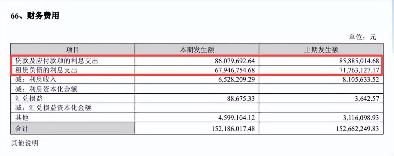 据2025中报,利息费用包括贷款及应付款项的利息支出、租赁负债的利息支出,金额分别为0.86亿元、0.68亿元,合计1.54亿元,高于当期财务费用的1.52亿元。