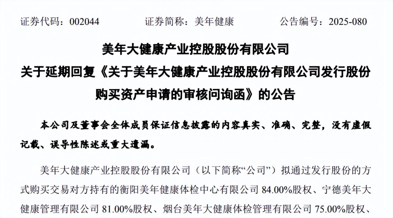9月20日,美年健康就上述问询进行回复,不过根据深交所进一步审核意见,公司对《审核问询函》回复文件进行修改、补充,在11月1日披露延期回复公告,自回复期限届满之日起延期不超过30日向深圳证券交易所提交修订后的《审核问询函》回复文件,目前尚未进行回复。