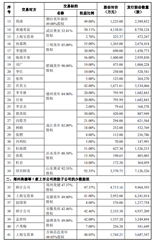8月,公司发行股份购买资产暨关联交易获得深交所受理,彼时公司约定收购发行价是4.73元/股,发行数量为9043.89万股,股份对价为4.28亿元。另外,收购标的公司从19家下降至16家,减少的企业包括宁美元康、安溪美年以及厦门银城美。