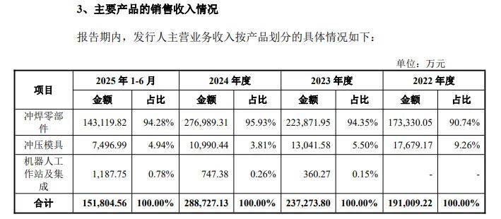 进一步来看,主营业务收入基本由冲焊零部件贡献,报告期实现收入分别为17.33亿元、22.39亿元、27.7亿元、14.31亿元,占比从90.74%上升至94.28%,与此同时,该产品毛利率也有所上升,分别为12.98%、13.49%、15.98%、15.47%,累计上升2.49个百分点,期末较2024年下滑0.51个百分点。