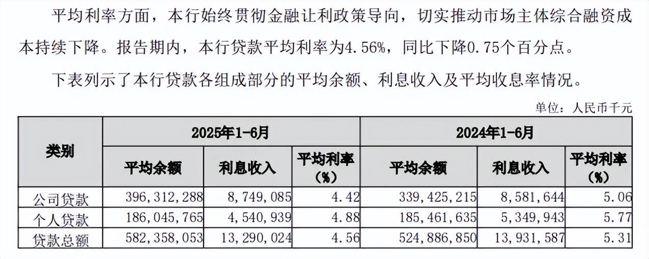 这一现象主要是由贷款平均利率持续下滑引起,从2022年的6.01%下滑至2025年中报的4.56%,累计下滑1.45个百分点。