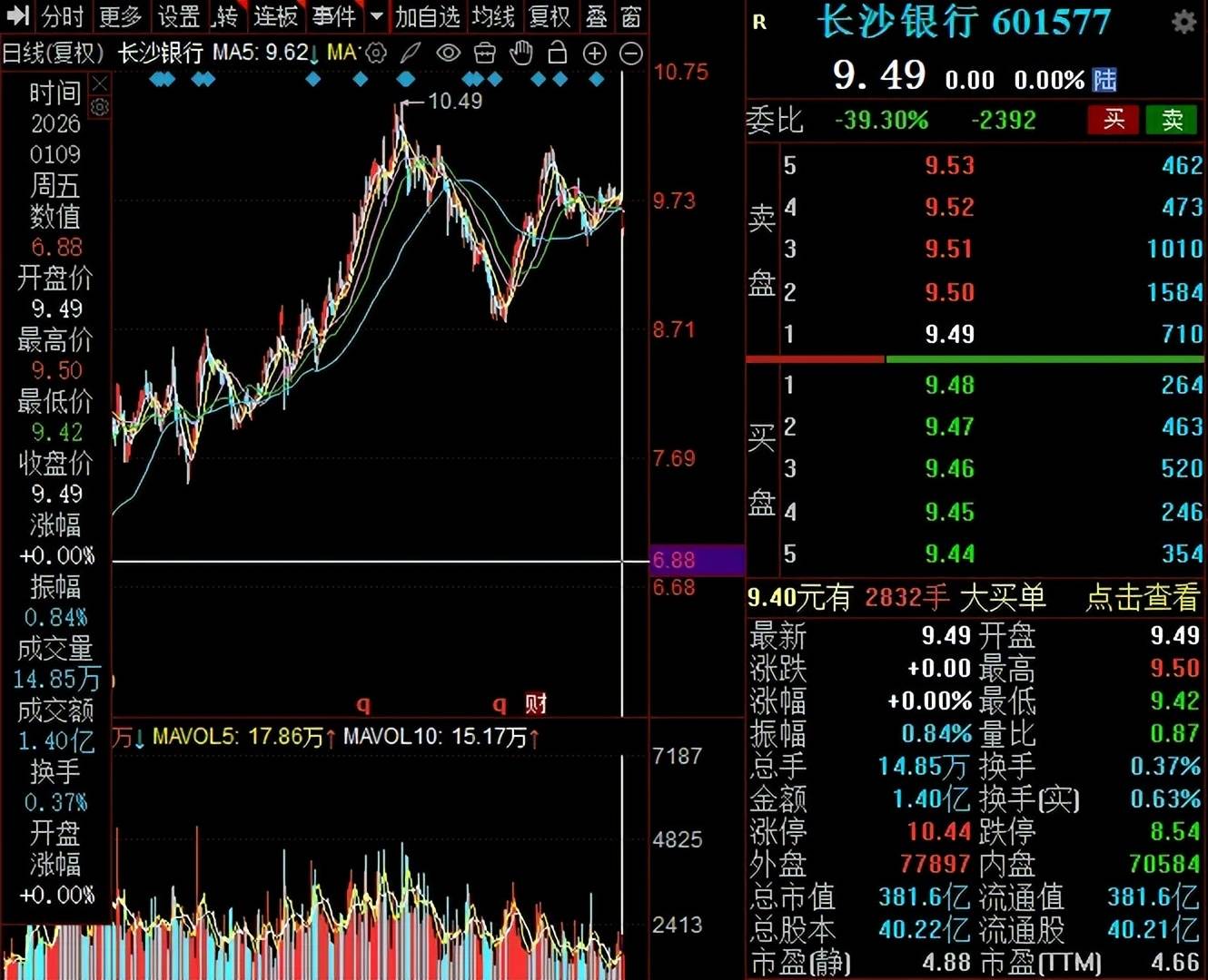 股东套现超1亿。二级市场上,长沙银行表现较为亮眼,自2024年9月的5.9元/股(前复权,下同)的低点一路上扬,高点至10.49元/股,2025年股价走势总体呈现“M型”,截至1月9日收盘,股价为9.49元/股,较高点跌幅不到10%,总体较为稳定,总市值381.6亿元,TTM市盈率4.66倍。