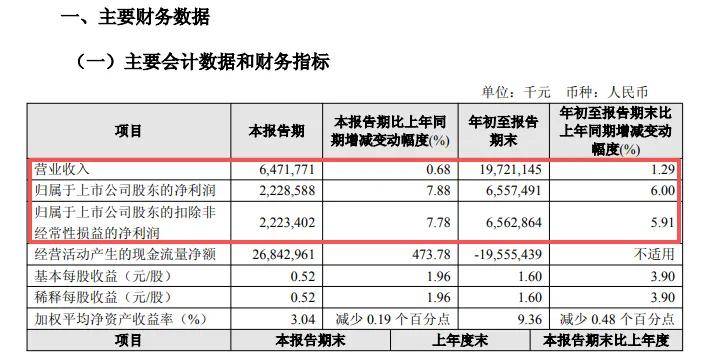 据短平快解读了解,2025年前三季度,公司实现营业收入、归母净利润分别为197.21亿元、65.57亿元,同比分别增长1.29%、6%,收入增速进一步放缓。