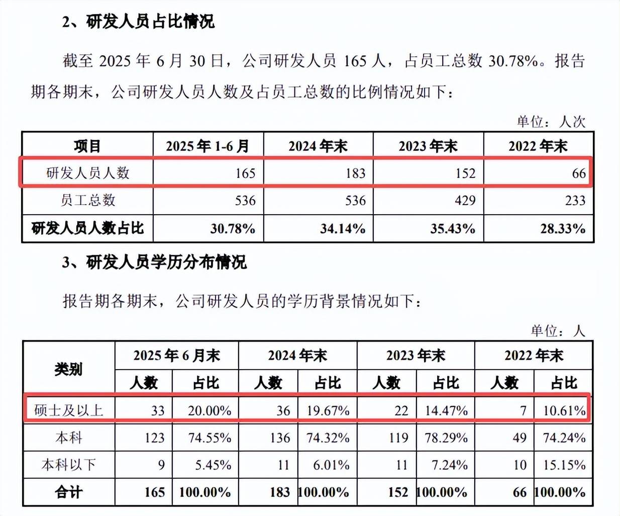 从研发薪酬来看,报告期内平均薪酬分别为25.8万元、25.89万元、29.55万元、15.03万元,2024年同比大增3.66万元。从学历来看,硕士及以上学历分别为7人、22人、36人、33人,2023年、2024年分别增加15人、14人,以此来看,2023年平均薪酬上涨较大的可能性较大,涨幅最大却发生在2024年。