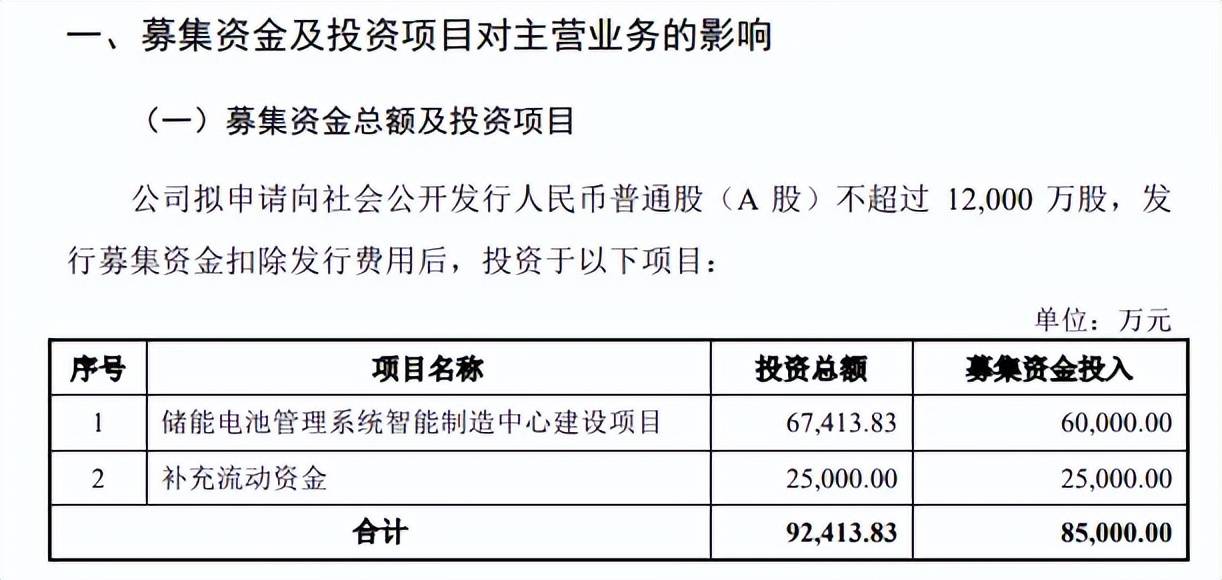 据短平快解读了解,本次IPO,高特电子拟公开发行不超过12,000万股,拟募集资金8.5元,用于储能电池管理系统智能制造中心建设项目以及补充流动资金,拟投入募集资金分别为6亿元、2.5亿元。