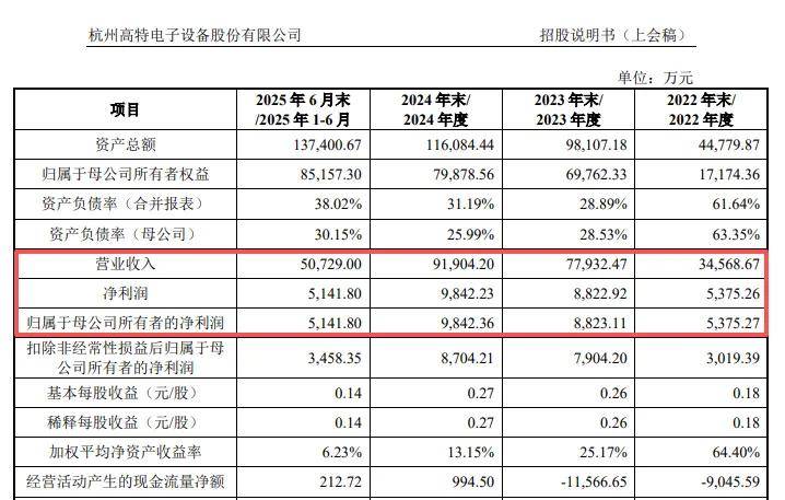 应收账款大增,经营质量亟待改善。事实上,虽然高特电子报告期业绩增长较为明显,但经营现金流情况却不容乐观,2022年、2023年分别净流出0.9亿元、1.16亿元,2024年、2025年1-6月分别净流入994.5万元、212.72万元,与净利润差距甚大,净利润现金含量分别仅为10.10%、4.14%。