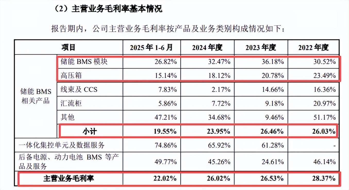 需要指出的是,主营业务毛利率呈现下滑态势,分别为28.37%、26.53%、26.02%、22.02%,累计下滑6.35个百分点,储能BMS相关产品毛利率从26.03%下滑至19.55%,累计下滑6.48个百分点,其中储能BMS模块从30.52%下滑至26.82%,累计下滑3.7个百分点,高压箱从23.49%下滑至15.14%,累计下滑8.35个百分点。