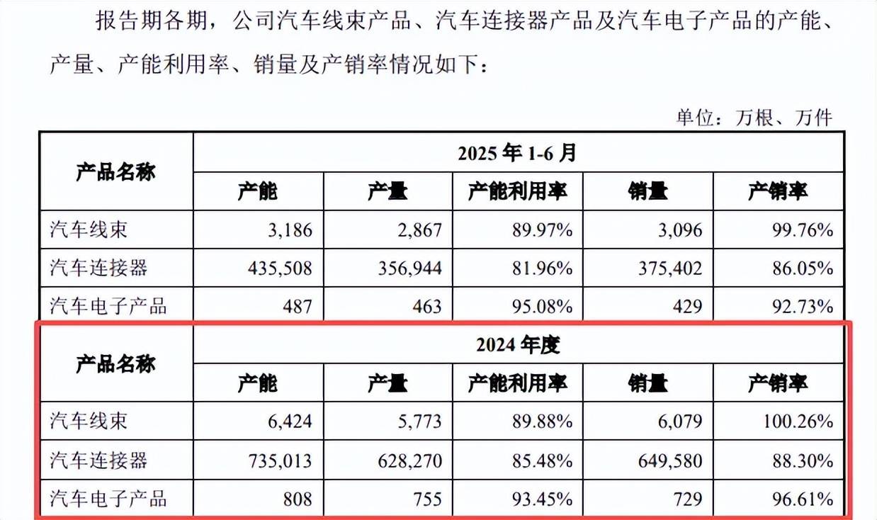 2022年至2025年1-6月(报告期),公司汽车连接器产能利用率分别为82.97%、85.19%、85.48%、81.96%;汽车线束分别为87.26%、87.58%、89.88%、89.97%;汽车电子产品分别为90.77%、82.05%、93.45%、95.08%。