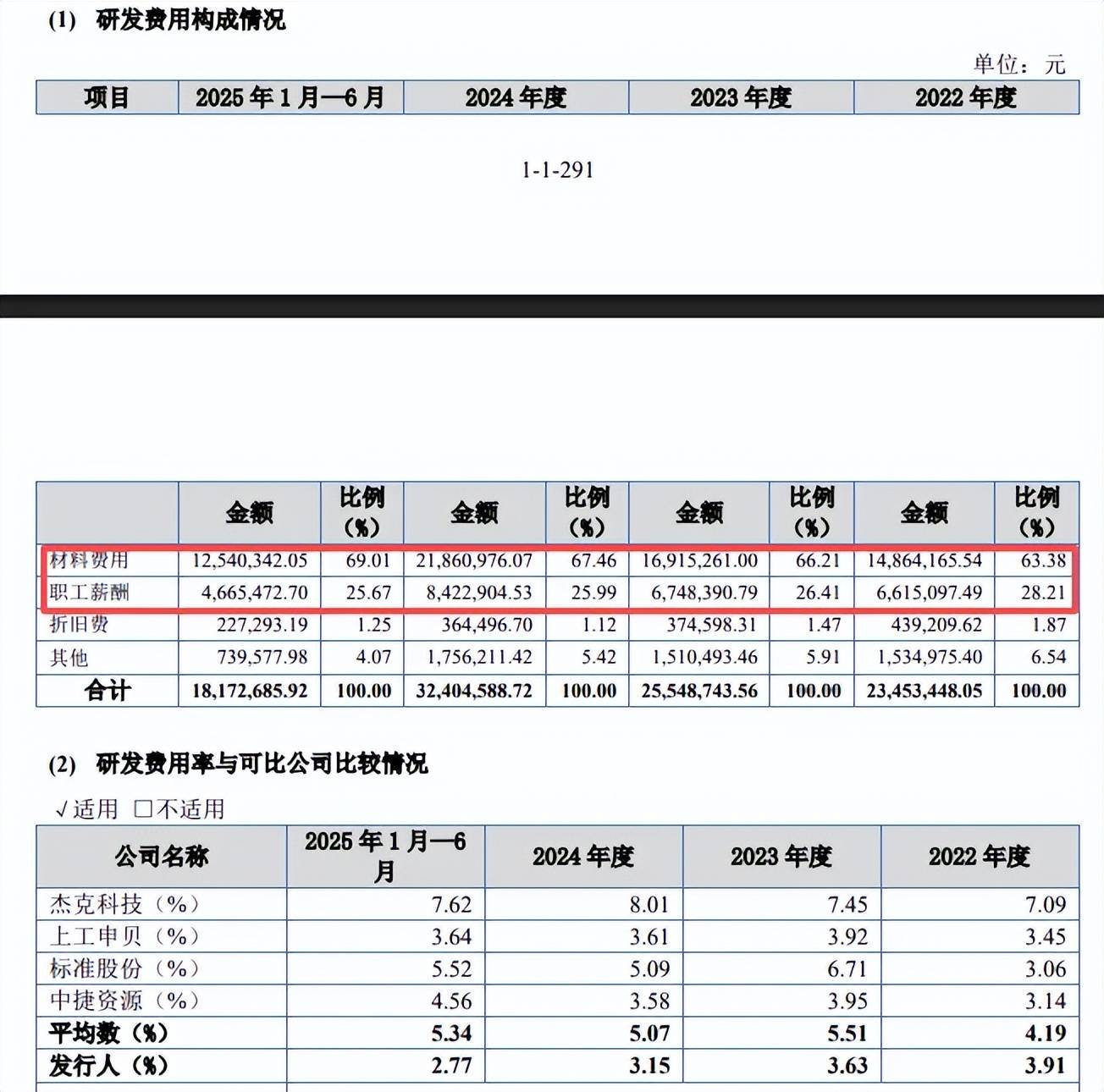 2024年、2025年1-6月,公司研发人员分别为44人、46人,占比分别为4.9%、4.57%,期末拥有专利383项,其中发明专利83项,发明专利占比约22%。