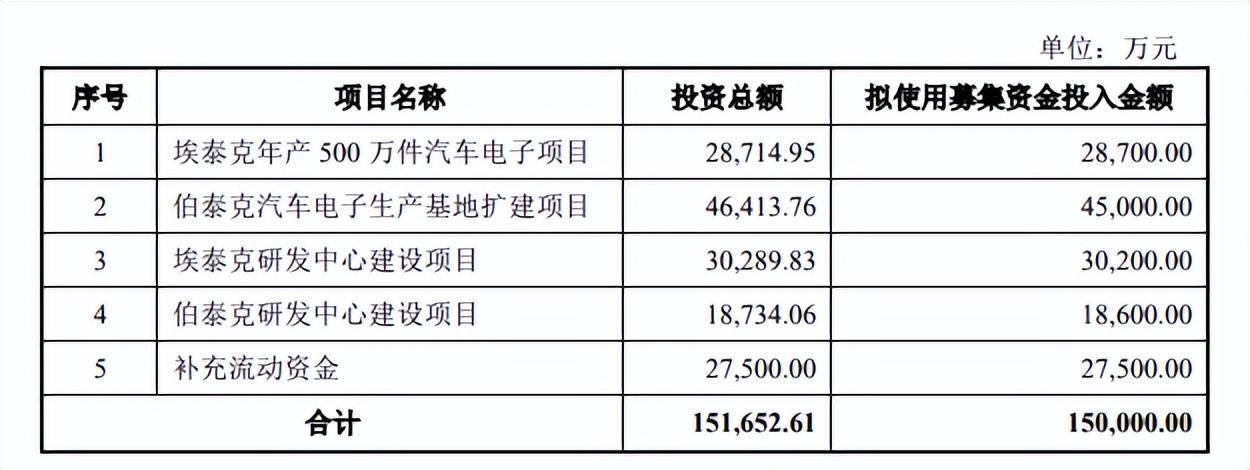 据短平快解读了解,本次IPO,埃泰克拟公开发行不低于4,477.27万股,拟募集资金15亿元,用于埃泰克年产500万件汽车电子项目、伯泰克汽车电子生产基地扩建项目、埃泰克研发中心建设项目、伯泰克研发中心建设项目以及补充流动资金,拟投入募集资金分别为2.87亿元、4.5亿元、3.02亿元、1.86亿元、2.75亿元。
