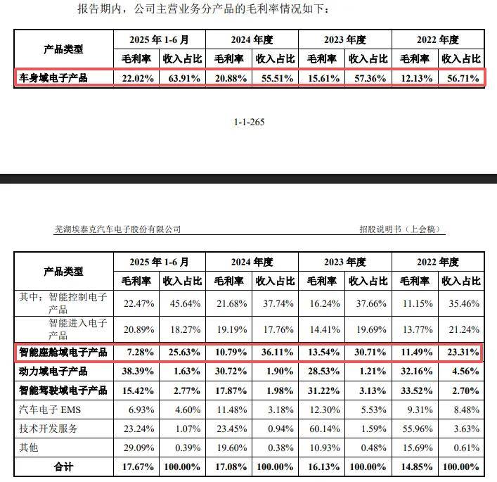 报告期内,主营业务毛利率分别为14.85%、16.13%、17.08%、17.67%,其中智能座舱域电子产品毛利率从12.13%上升至22.02%,累计上升9.89个百分点,智能座舱域电子产品毛利率从11.49%下滑至7.28%,累计下滑4.21个百分点。
