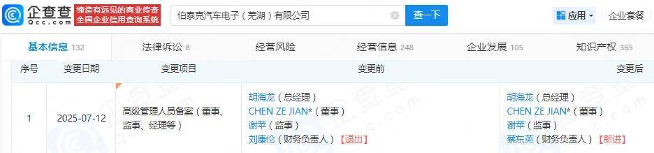 招股书显示,蔡东英在员工持股平台芜湖顺泰投资合伙企业(有限合伙)的出资比例为2.4%,是公司管理人员骨干,另据企查查,其目前是公司子公司芜湖易来达雷达科技有限公司、伯泰克汽车电子(芜湖)有限公司的财务负责人,在后者担任该职务的时间是2025年7月起,原财务负责人刘康伦则退出。