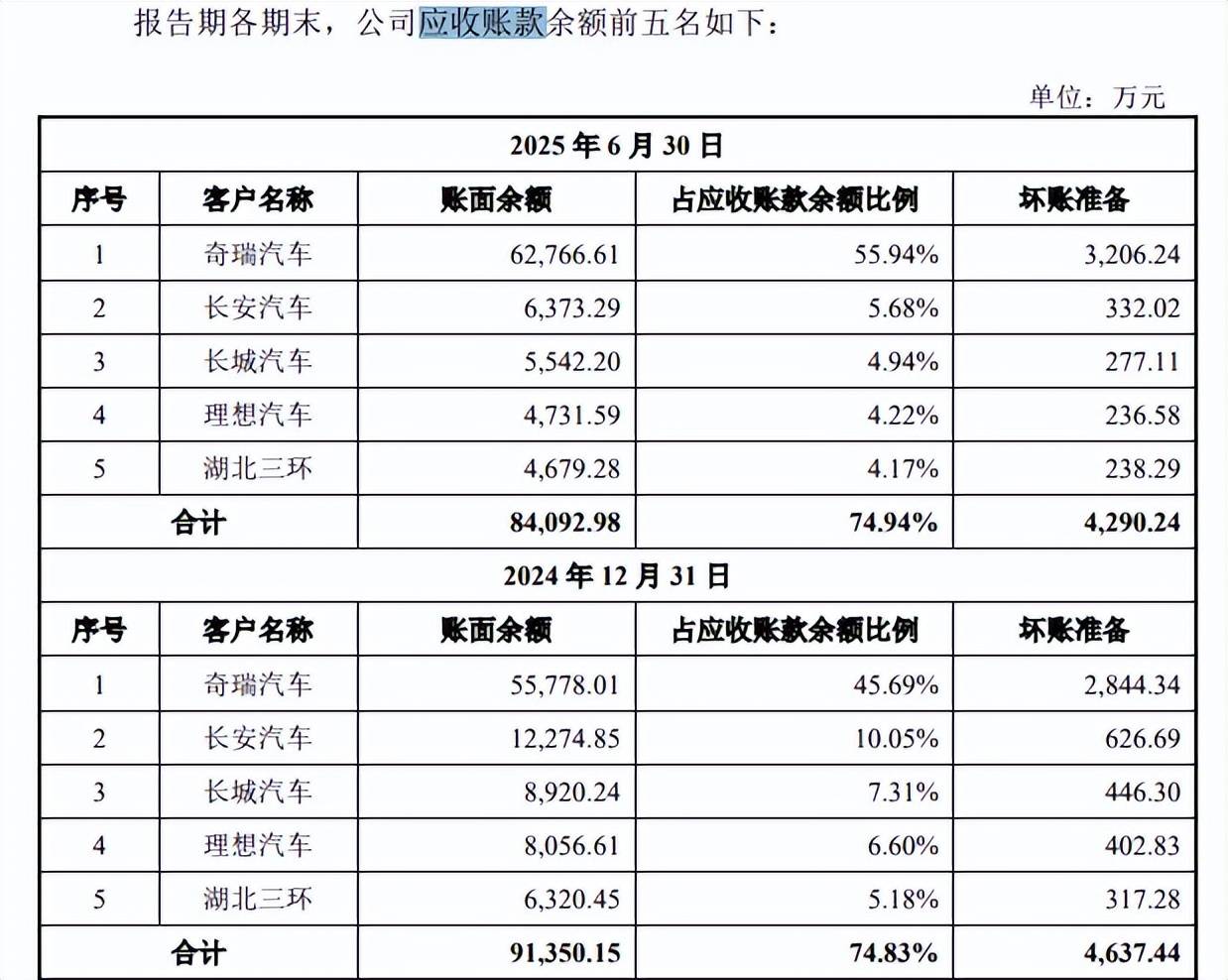进一步来看,应收账款主要来自于奇瑞汽车,报告期内分别为24,218.83万元、42,287.04万元、55,778.01万元、62,766.61万元,占比分别为32.51%、39.12%、45.69%、55.94%,产生的坏账准备分别为1,563.04万元、2,125.80万元、2,844.34万元、3,206.24万元。