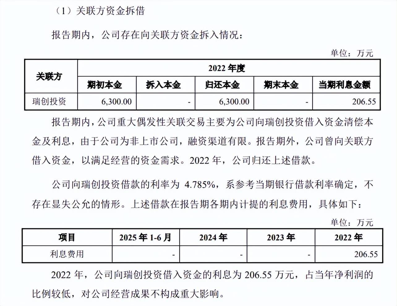 曾拆入6300万元。2022年初,埃泰克对瑞创投资的拆入资金为6300万元,主要为清偿本金及利息,相关借款利率为4.785%,2022年归还相关借款、利息,当期利息费用206.55万元。