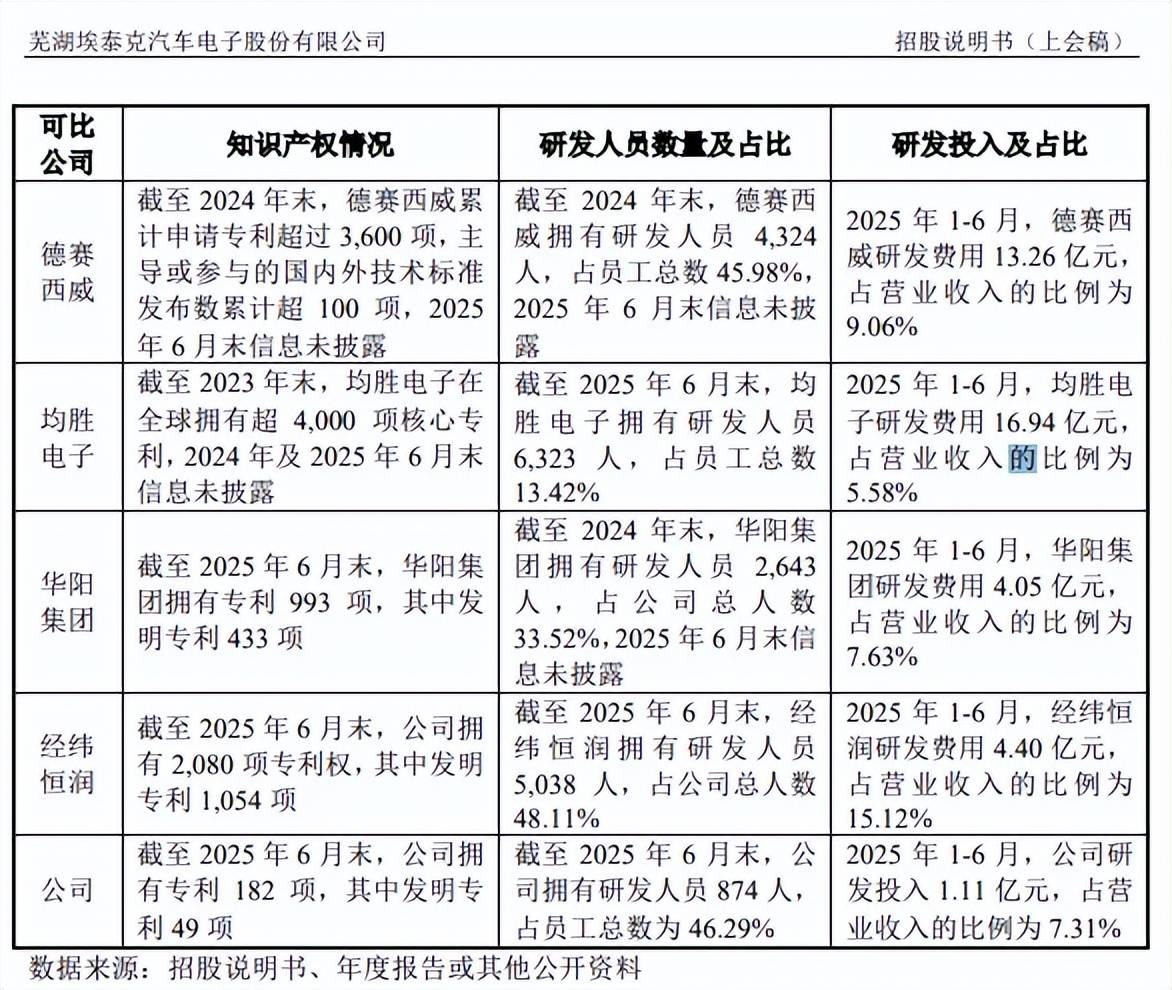 截至期末,公司拥有专利182项,其中发明专利49项,而德赛西威2024年末拥有专利超过3600项、均胜电子2023年拥有专利超过4000项,华阳集团、经纬恒润2025年6月末的专利数量分别为993项、2080项,其中发明专利分别为433项、1054项,显然公司的专利数量以及发明专利数量在这些同行中均处于末端。