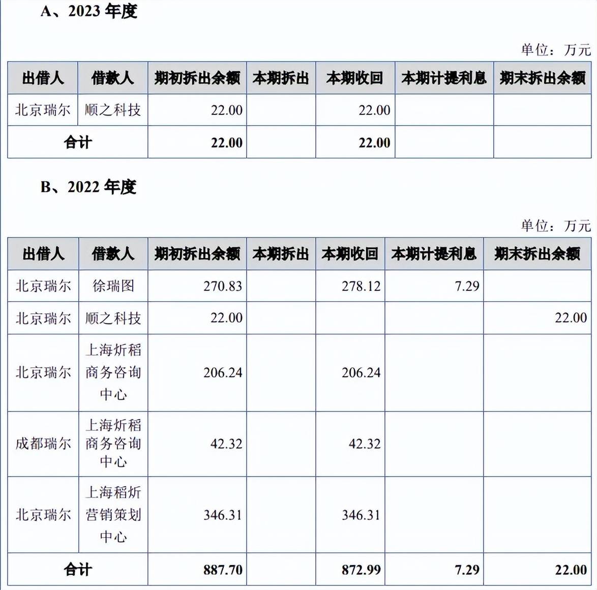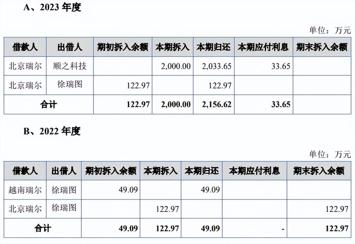 2022年初,越南瑞尔向徐瑞图拆入49.09万元,当年归还;2022年,北京瑞尔向徐瑞图拆入122.97万元;2023年,北京瑞尔向顺之科技拆入2000万元,当期连本带利归还2033.65万元,同时期归还2022年向徐瑞图拆入的资金。
