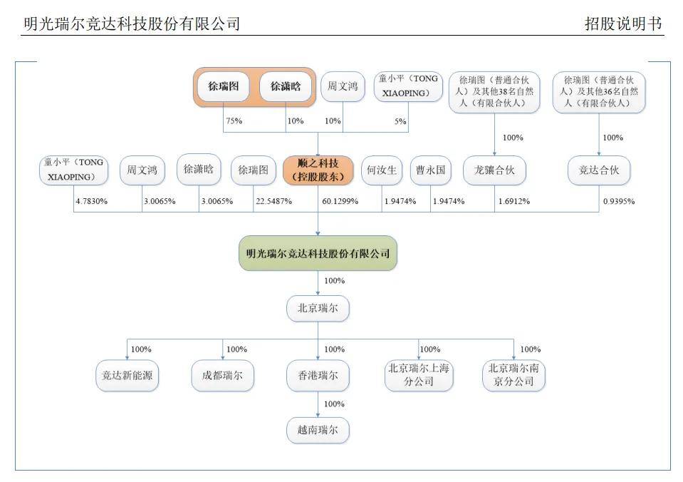 父女表决权超88%。瑞尔竞达控股股东是顺之(明光)科技有限责任公司(顺之科技),直接持股比例60.13%,实际控制人是徐瑞图、徐潇晗父女,分别直接持股22.55%、3.01%,并且通过顺之科技、龙骧合伙、竞达合伙间接控制公司62.76的表决权,合计表决权88.32%。