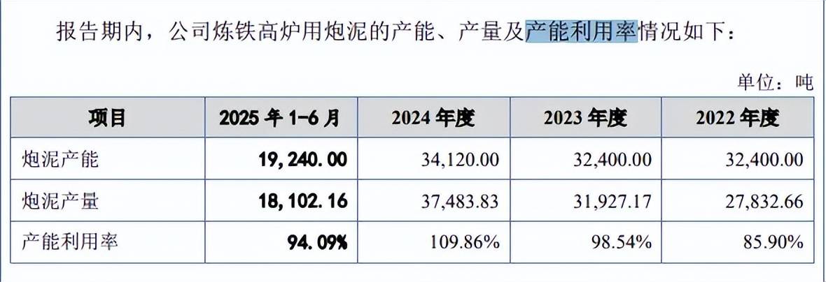 报告期内,公司炼铁高炉用炮泥产能利用率分别为85.9%、98.54%、109.86%、94.09%,2024年产能34,120吨,技改后新增产能约是现有产能的64%。