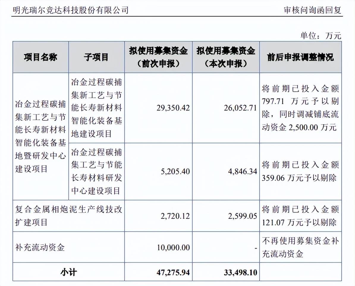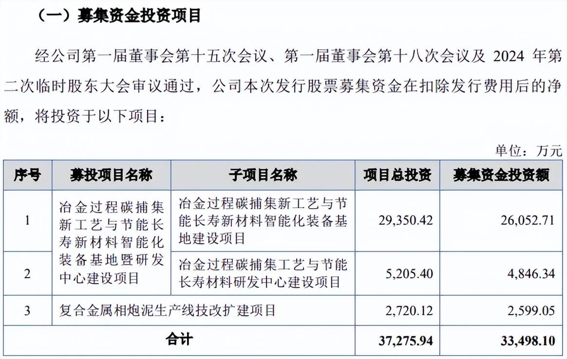 本次IPO,瑞尔竞达拟公开发行不超过44,350,000股(未考虑超额配售选择权),拟募集资金3.35亿元,用于冶金过程碳捕集新工艺与节能长寿新材料智能化装备基地建设项目(基地建设项目)、冶金过程碳捕集工艺与节能长寿材料研发中心建设项目以及复合金属相炮泥生产线技改扩建项目(技改扩建项目),拟投入募集资金分别为2.61亿元、0.48亿元、0.26亿元。