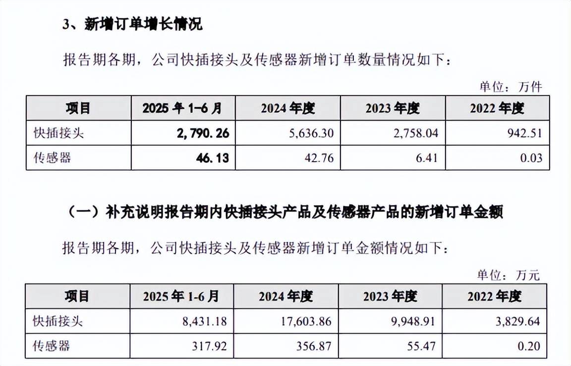 报告期内,快插接头新增订单数量分别为942.51万件、2,758.04万件、5,636.30万件、2,790.26万件,对应的订单金额分别为3,829.64万元、9,948.91万元、17,603.86万元、8,431.18万元。