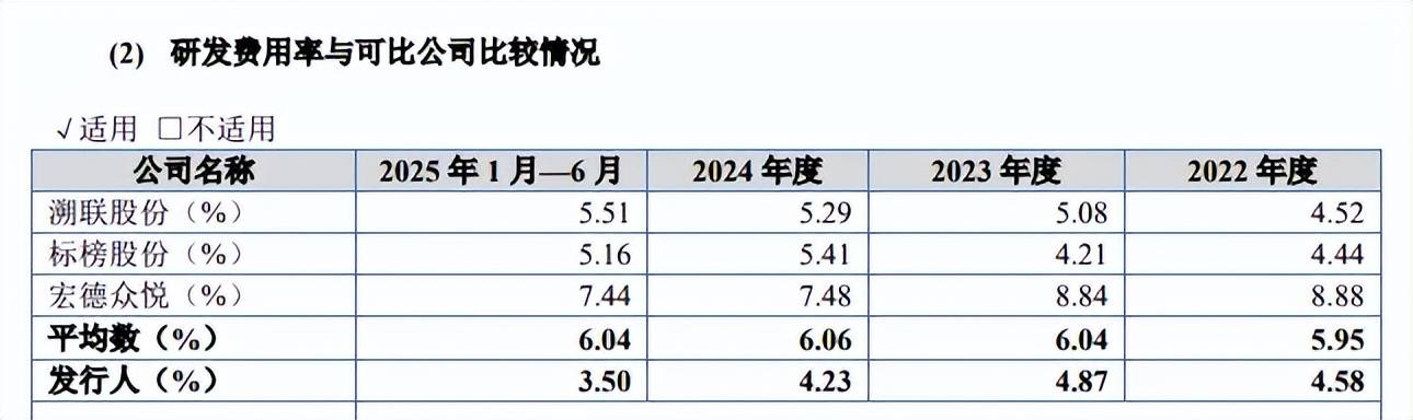 对比行业,可比同行研发费用率均值分别为5.95%、6.04%、6.06%、6.04%,仅高于公司,2024年、2025年1-6月,溯联股份、标榜股份、宏德众悦的研发费用率均超过公司,期末分别为5.51%、5.16%、7.44%。