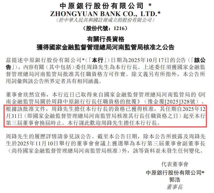 1月5日,中原银行公告称,周锋担任本行行长已经获得获得核准,任期自2025年12月31日起至第三届董事会换届时止。1月7日,公司公告周锋任职董事、副董事长资格获得核准。