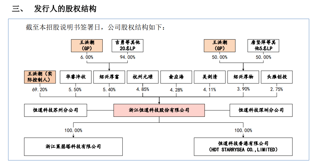 实控人表决权超78%。恒道科技控股股东、实际控制人均为王洪潮,直接持股比例为69.2%,其控制的绍兴厚富、绍兴厚物分别持股5.4%、3.9%,即王洪潮合计控制公司78.50%股权对应的表决权。