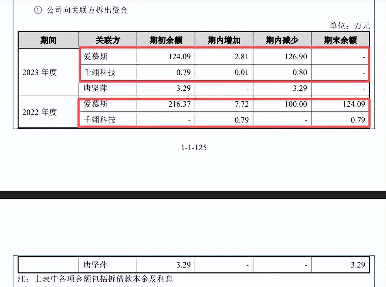 曾拆出超200万元。报告期内,恒道科技存在关联方资金拆借事项,2022年初、2023年初拆出资金余额分别为219.66万元、128.17万元,其中对绍兴爱慕斯科技有限公司(爱慕斯)的拆出余额分别为216.37万元、124.09万元,2023年初对绍兴千翊科技有限公司(千翊科技)拆出余额为0.79万元。